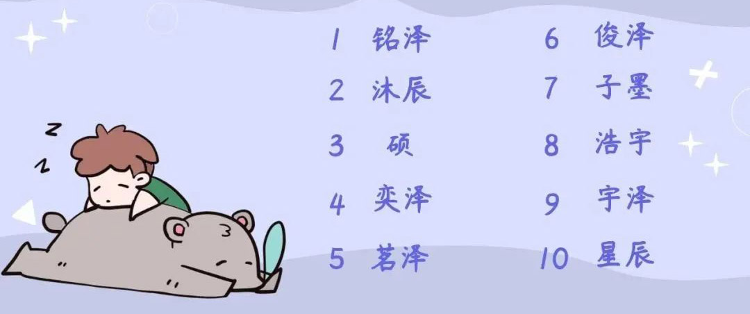 基于2022年隆化落户的数万个新生男宝宝的数据,最热名字的前三名分别是“铭泽”“沐辰”“硕”,最常用字的前三名分别是“泽”“宇”“子”,有63个宝宝叫“铭泽”。